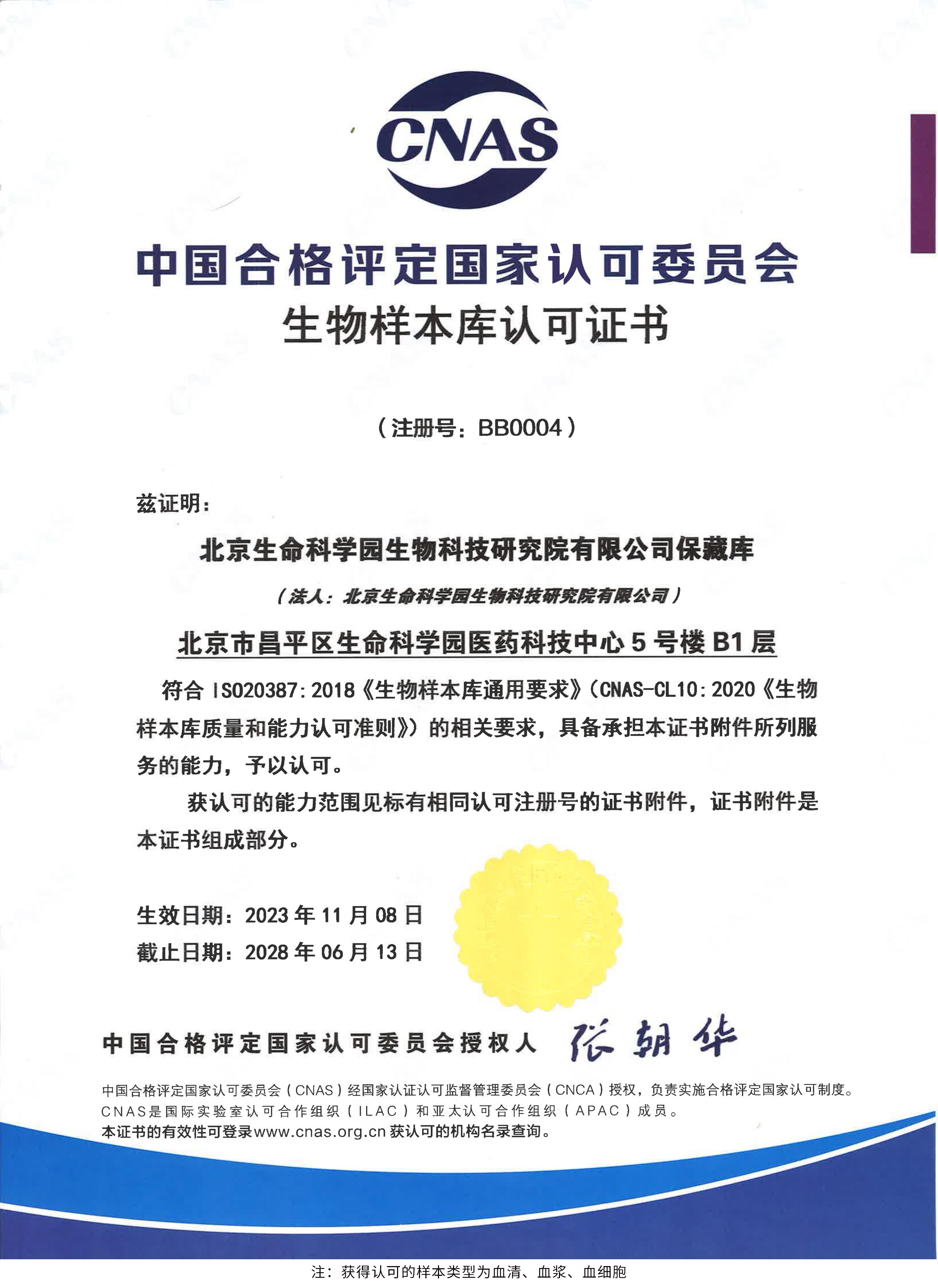北京生命科學園生物科技研究院(以下簡稱“北京生物樣本資源庫”)(Biobank of Life Science Park,簡寫“BoLSP”)是一家由北京市科委和中關村生命科學園共同支持設立的第三方生物樣本庫公共服務平臺,秉承北京重大疾病臨床數據和樣本資源庫(以下簡稱“北京庫”)(Beijing Biobank of Clinical Resources,BBCR)十余年的發(fā)展成果,聚合眾多臨床樣本專家的專業(yè)共識,致力于在生命科學、生物醫(yī)藥研究領域發(fā)揮銜接樣本資源持有者與研究者的橋梁作用,解決生物樣本資源開發(fā)上下游信息不對稱、資源共享困難等問題。研究院在北京中關村生命科學園昌平園區建立了2000㎡生物樣本庫,最大存儲規(guī)模達1000萬份。研究院遵循CNAS-CL10:2020《生物樣本庫質量和能力認可準則》,同時結合北京庫過去十年的工作經驗與教訓,建立了一套完善的生物樣本保藏質量管理體系,從人、機、料、法、環(huán)、控多個角度,實現生物樣本保藏過程的全面質量控制,先后獲得國家科技部頒發(fā)的人類遺傳資源保藏行政許可證書和中國合格評定國家認可委員會(China National Accreditation Service for Conformity Assessment,CNAS)頒發(fā)的“CNAS認可證書”。